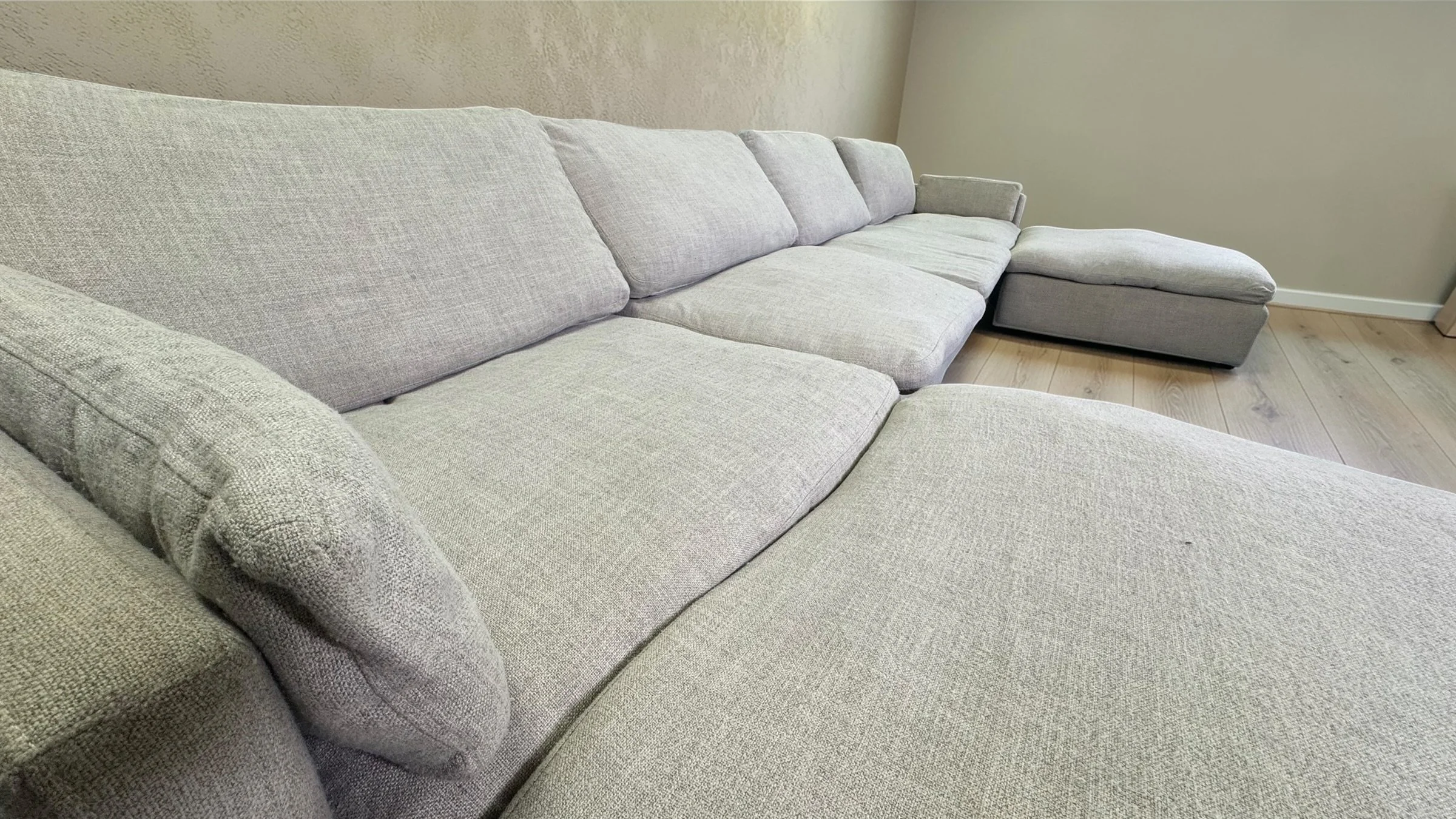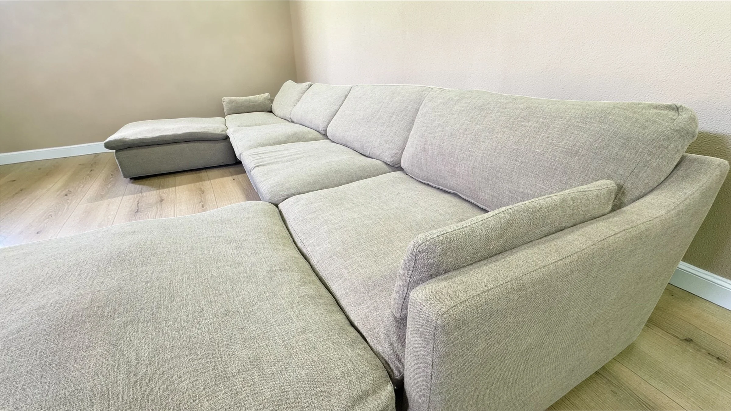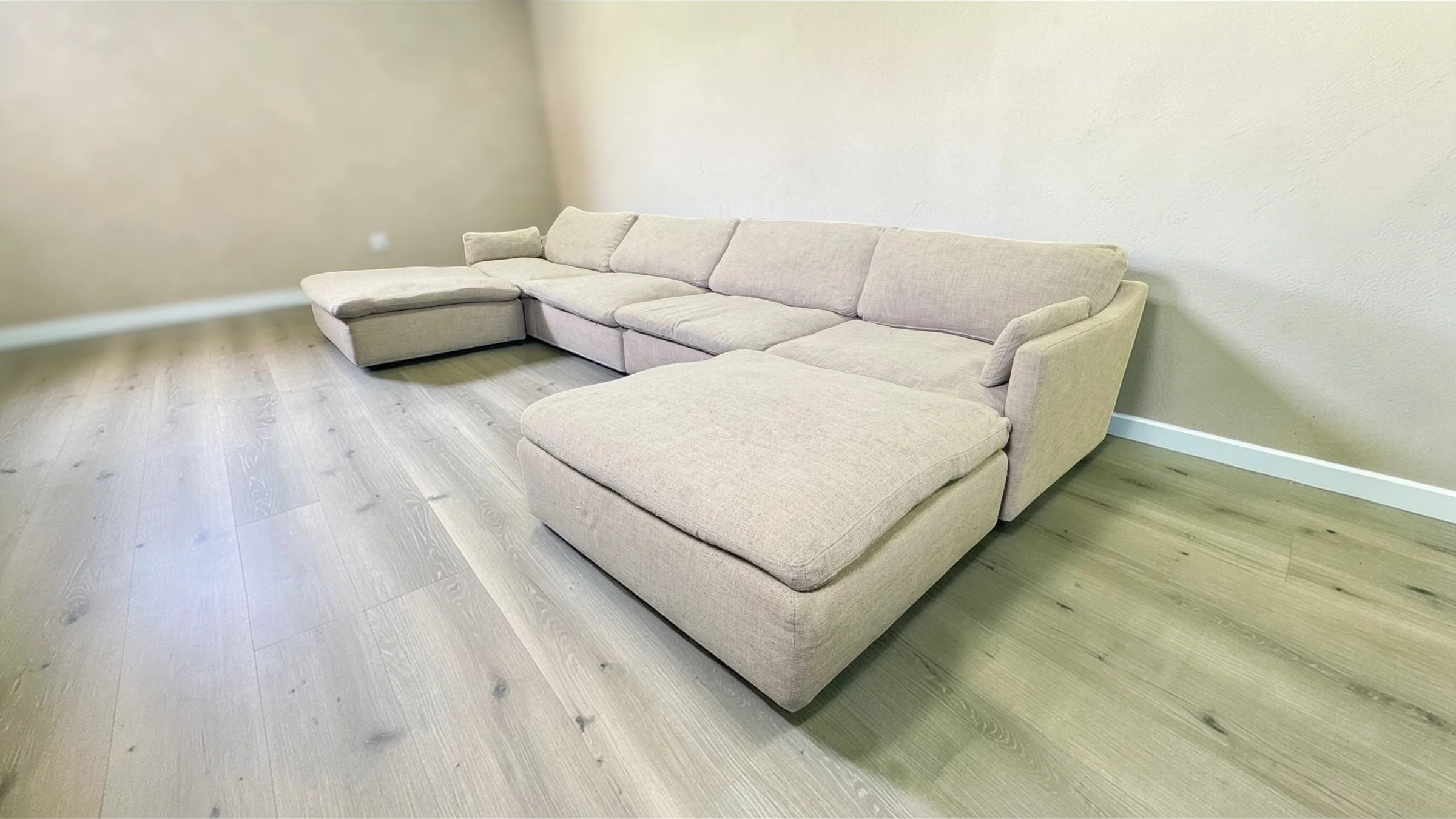 Super comfy with down-filled cushions. Modular layout so you can arrange the pieces to best fit your space.