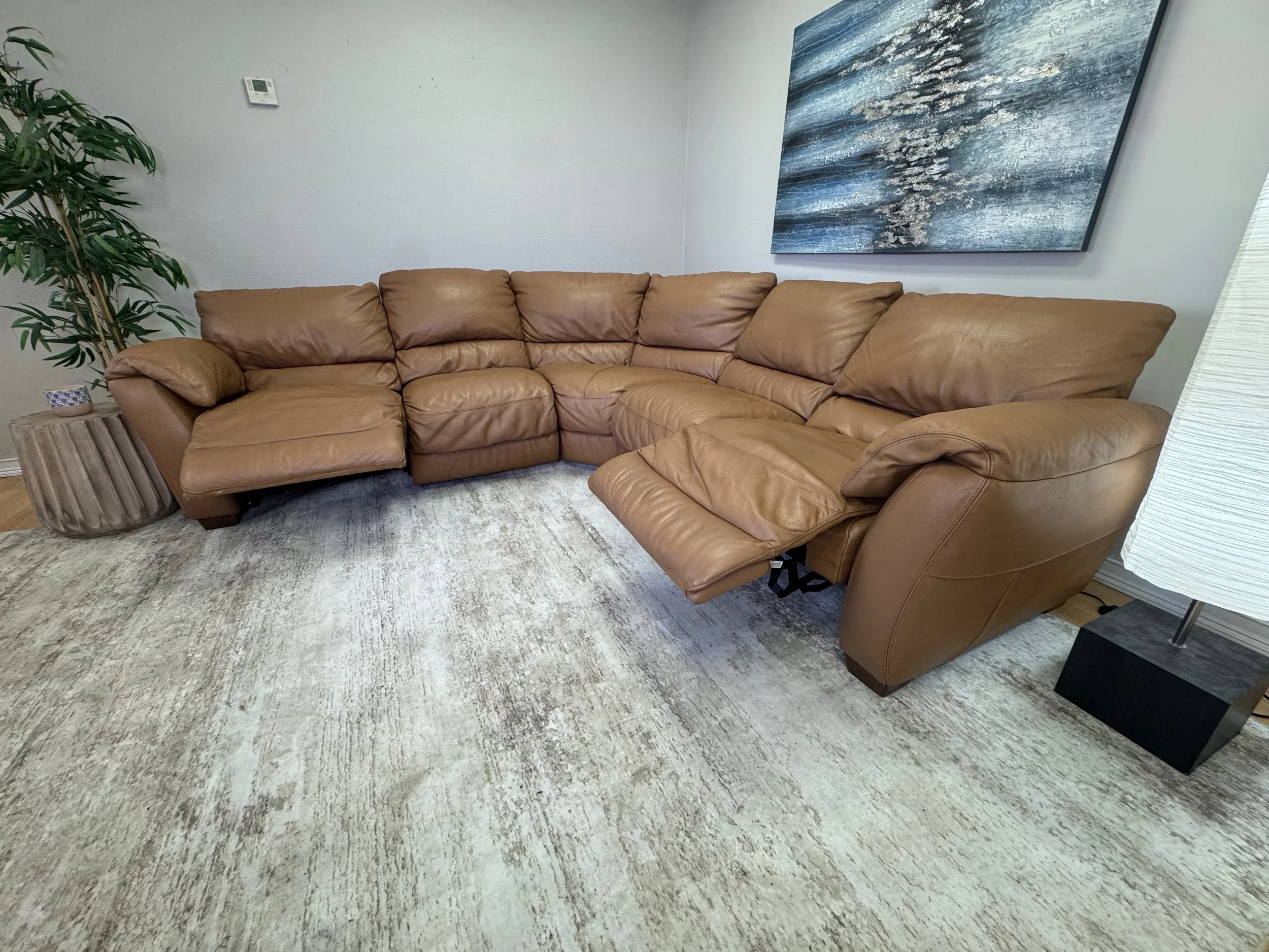 Genuine Top Grain Caramel Italian Leather with deep supportive seating & 2 manual recliners! Solid, comfortable, and built to last!