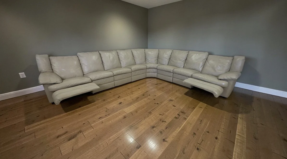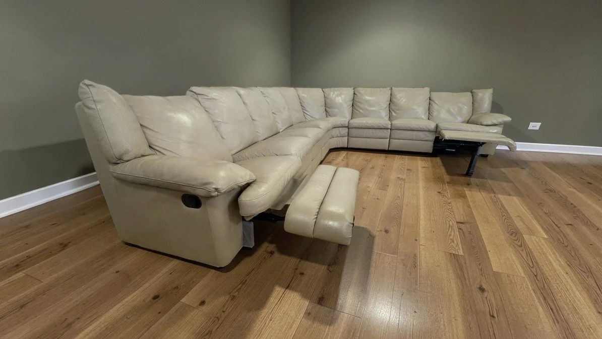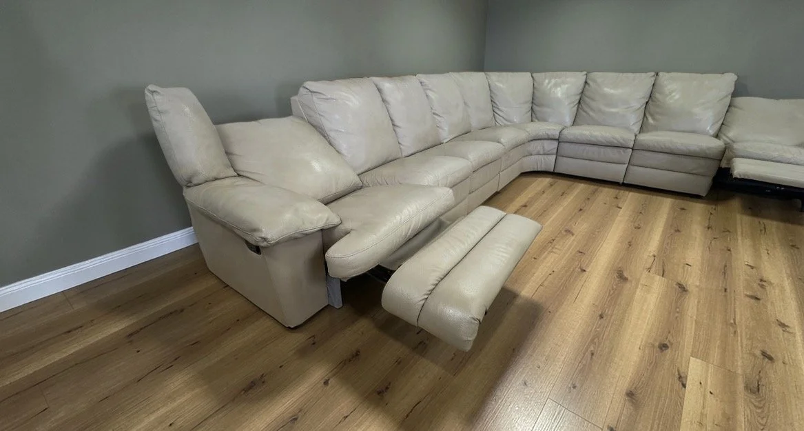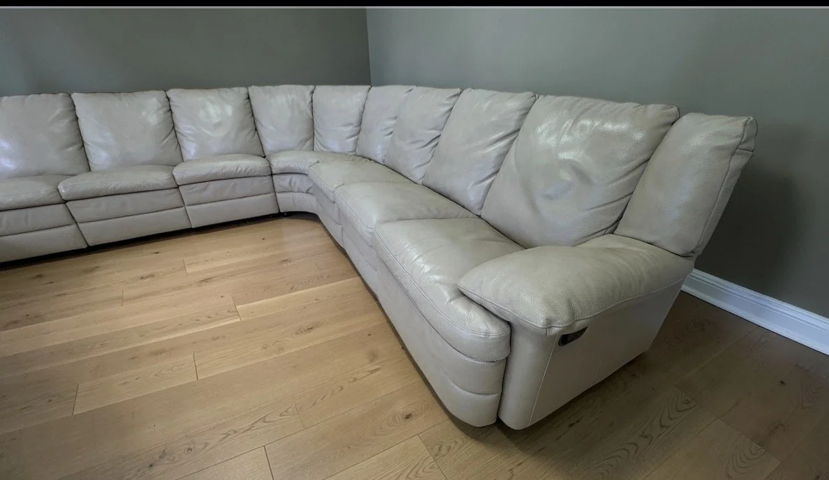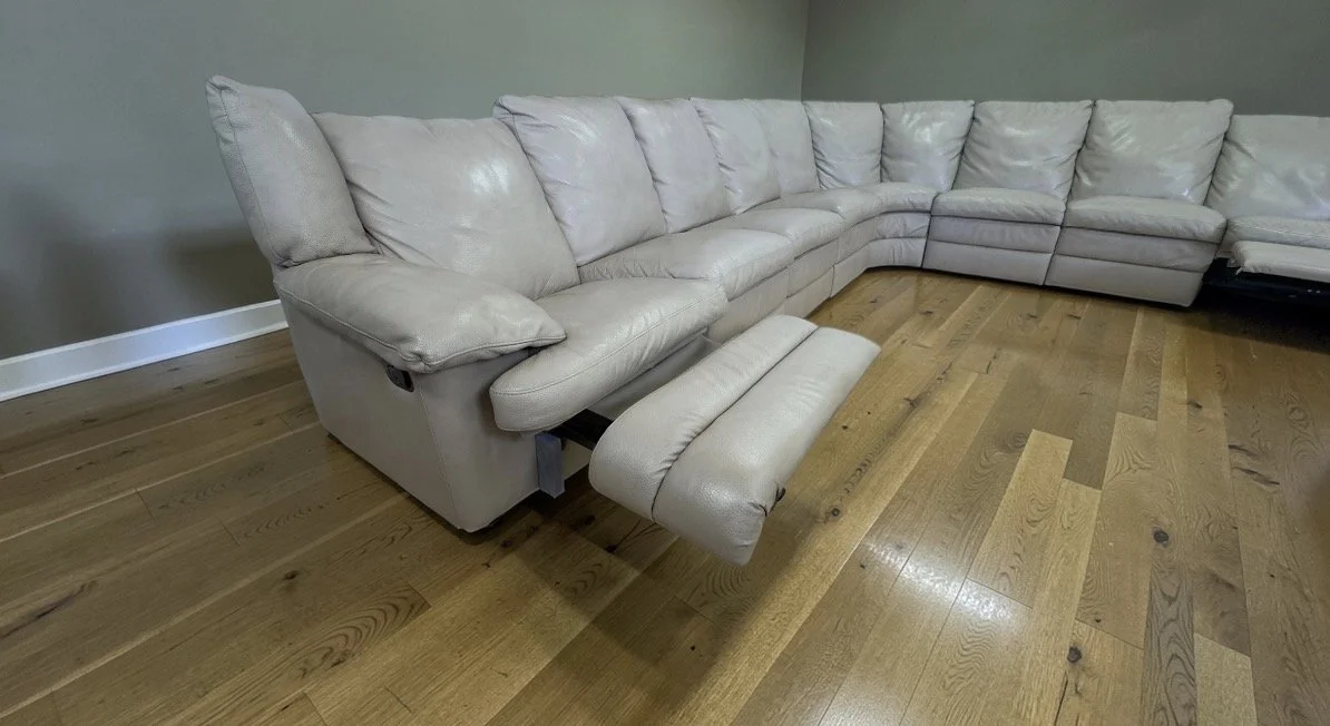 Extra large and modular so you can change the layout. Two manual recliners. Six pieces total. Top grain leather made in Italy.