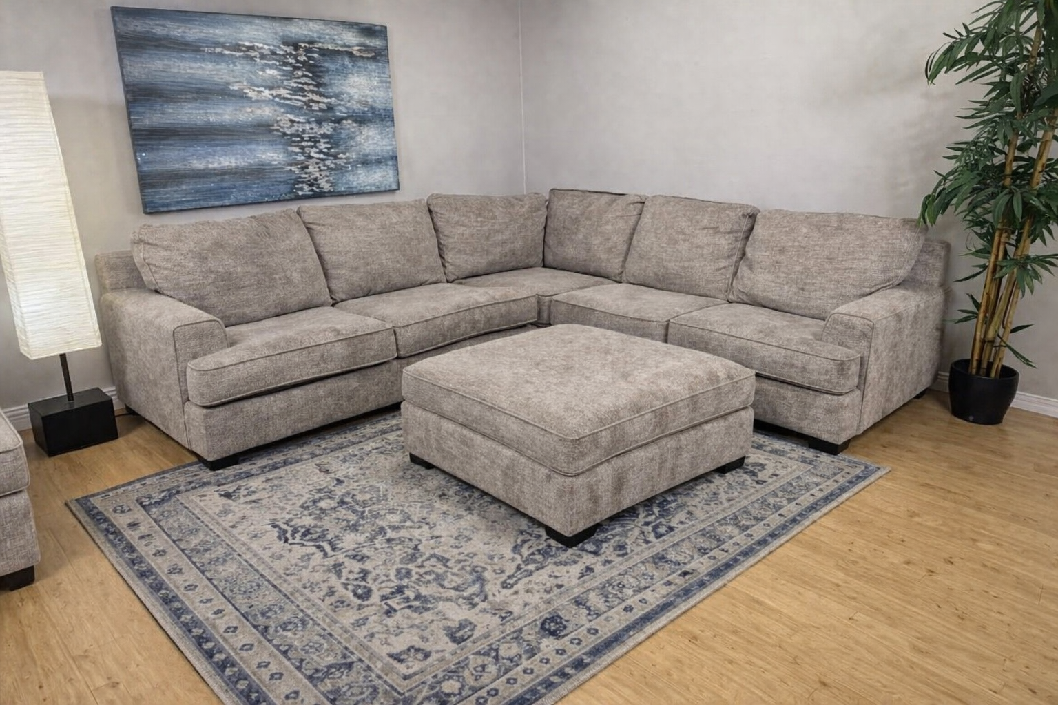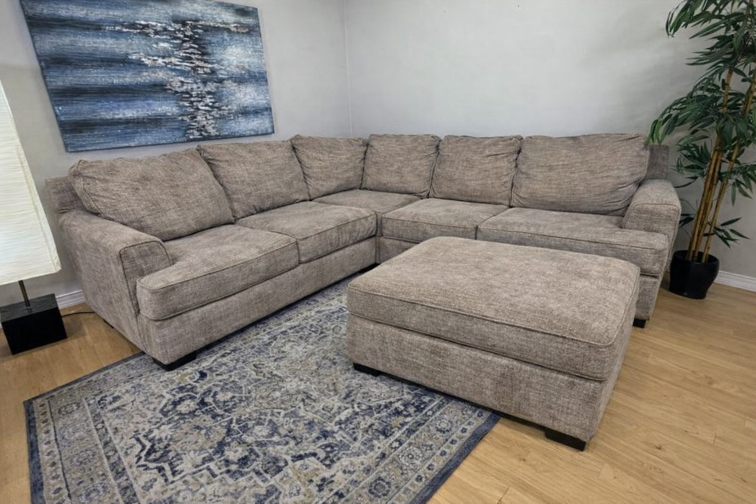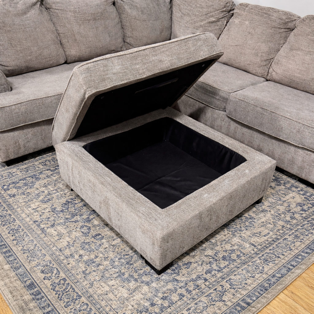 Super comfy with medium firm cushions and a storage ottoman. The entire couch has been deep cleaned and the cushion covers have been washed.