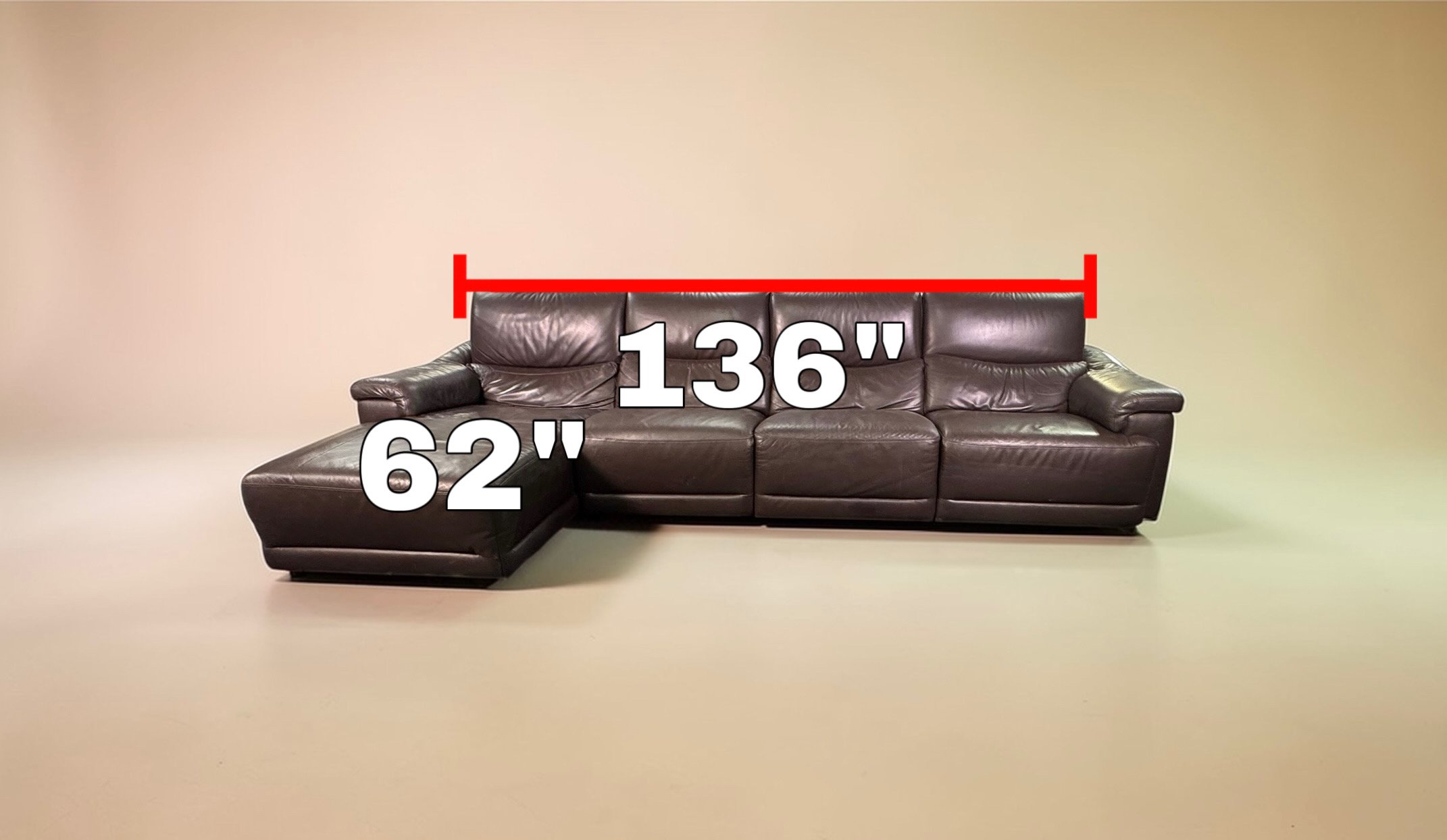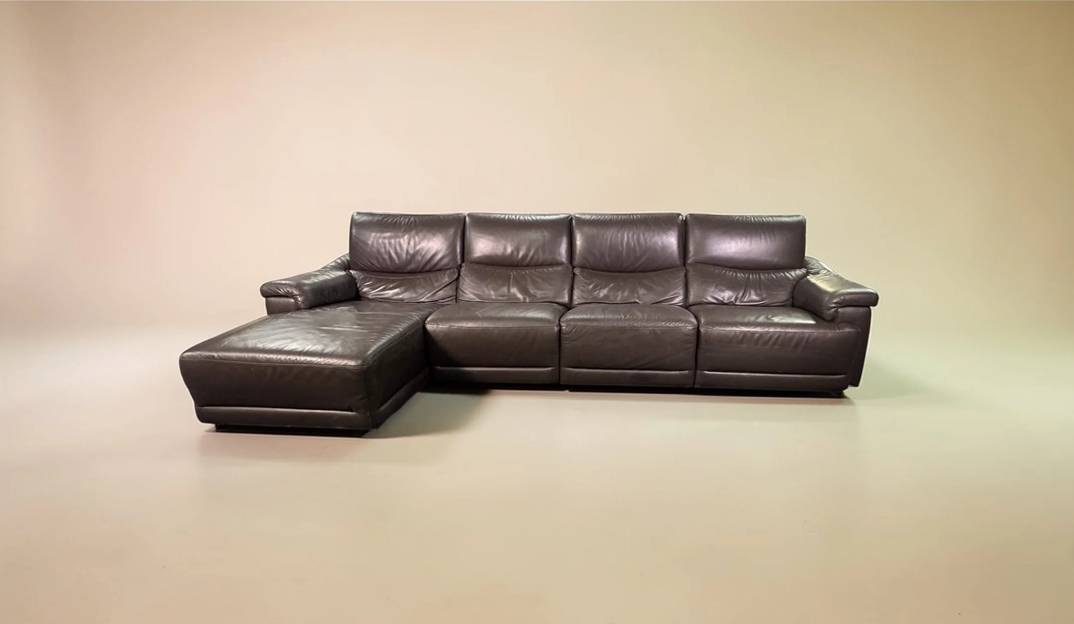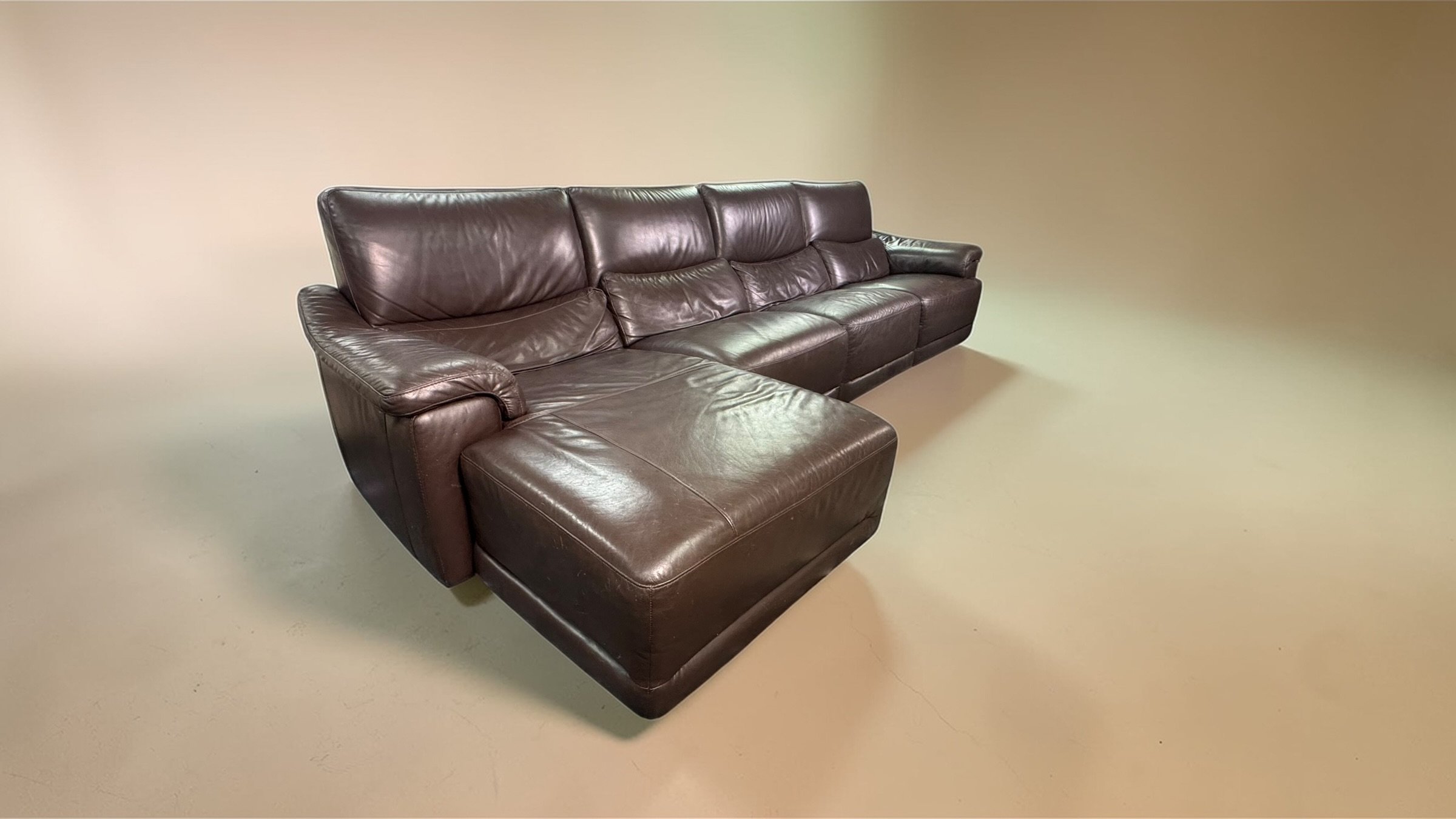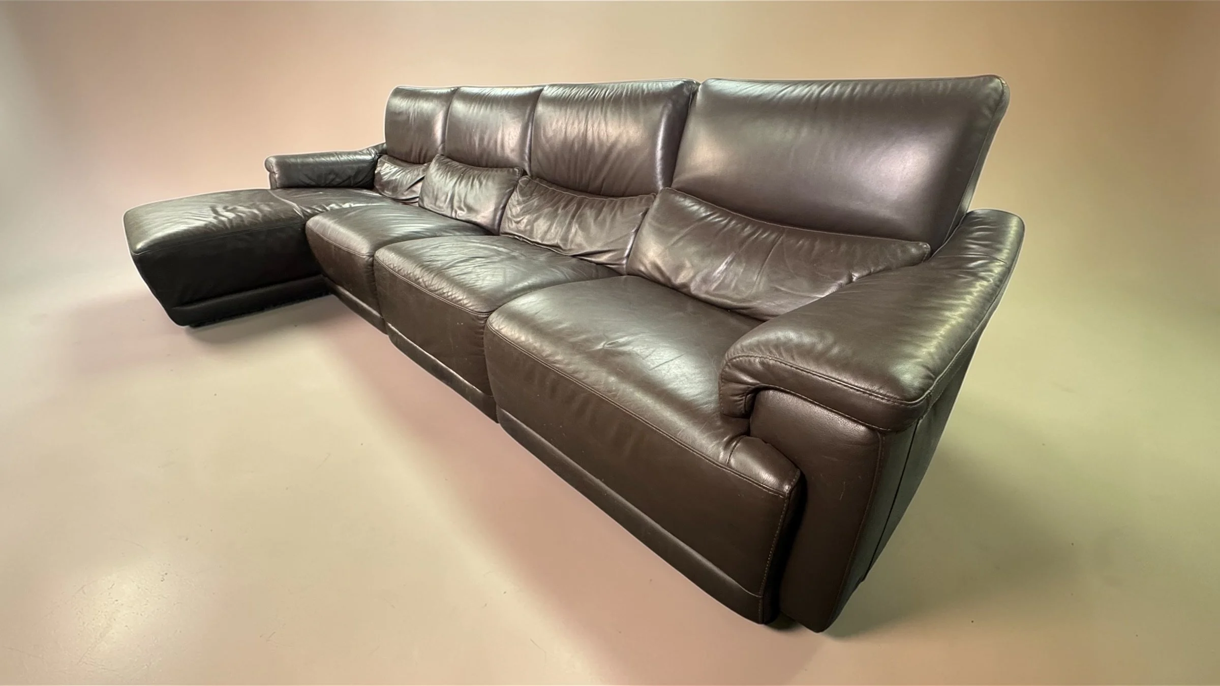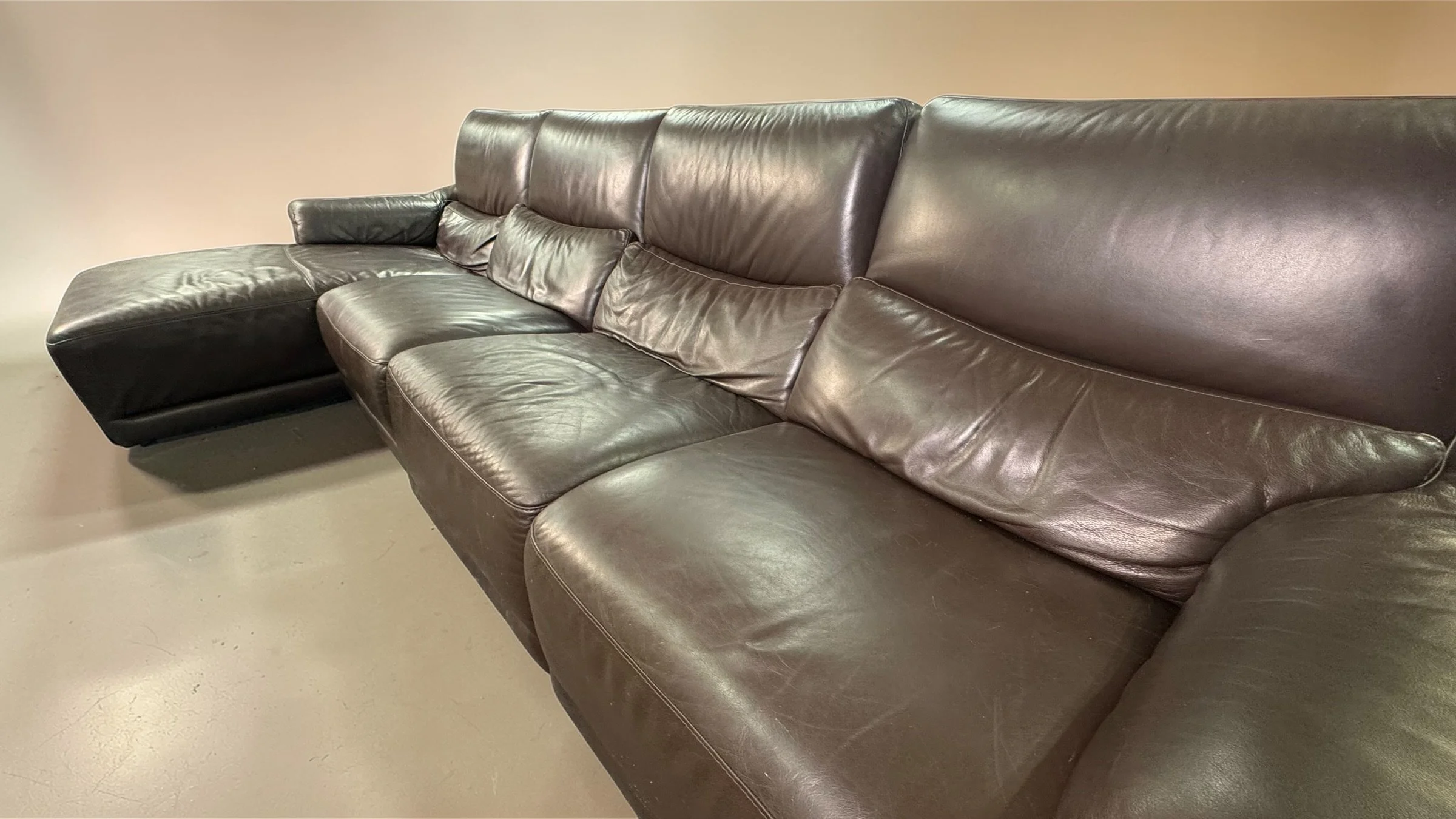 Comfy and cozy with rich brown Italian leather. Medium firm cushions and a long chaise to stretch out on.